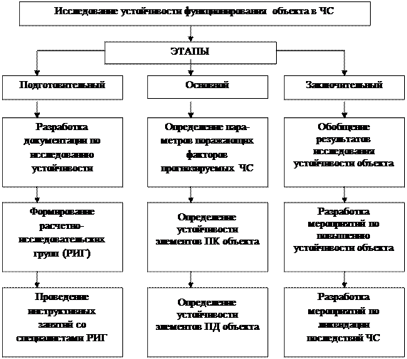 Исследование устойчивости функционирования объекта в ЧС проводится поэтапно (рис.1), по определенным методикам.