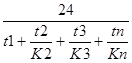 где 24 - количество часов в сутках; t1 - время открытого пребывания людей на зараженной местности (t1); t2 , t3 , tn, - время пребывания людей в течении этих суток в укрытиях, зданиях, транспортных средствах и т.п. (ч); K1, К2. Kn, - коэффициенты ослабления гамма-излучения укрытиями, зданиями и т.п.