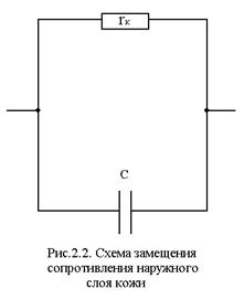 Между воздействующим током и напряжением существует нелинейная зависимость: с увеличением напряжения ток растет быстрее. Это объясняется главным образом нелинейностью электрического сопротивления тела человека. На участке между двумя электродами электрическое сопротивление тела человека в основном состоит из сопротивлений двух тонких наружных слоев кожи, касающихся электродов, и внутреннего сопротивления остальной части тела. Плохо проводящий ток наружный слой кожи, прилегающий к электроду, и внутренняя ткань, находящаяся под плохо проводящим слоем, как бы образуют обкладки конденсатора емкостью С и сопротивлением его изоляции Vн
