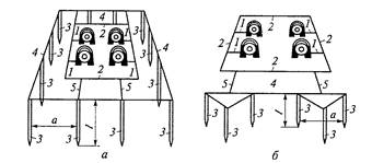 Рис. 1. Контурное (а) и очаговое (б) защитные заземления: 1- электродвигатели (объекты заземления); 2 – заземляющие шины внутреннего контура; 3 – заземлители; 4 – соединяющие шины; 5 – соединительные провода; а – расстояние между заземлителями; 𝒍 – длина заземлителя.