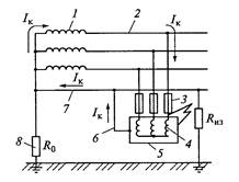 Рис. 3. Принципиальная схема устройства защитного отключения: 1 – реле максимального тока; 2 – трансформатор тока; 3 – проводник; 4 – заземлитель; 5 – электродвигатель; 6 – пускатель; 7 – блок-контакты; 8 – сердечник; 9 – катушка; 10, 12, 13 – кнопки; 11 – вспомогательное сопротивление.