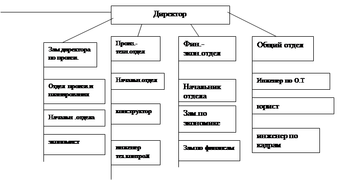 В подчинении директора находятся зам. директора по производству, финансово-экономический отдел, общий отдел, хозяйственный отдел.