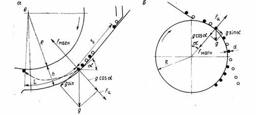 Режим извлечения. В этом случае руда подается под ленту, барабан или валок и перемещается по рабочей зоне сепаратора по прямолинейной или криволинейной траектории. Рассмотрим динамику процесса сухой магнитной сепарации при криволинейном перемещении руды через рабочую зону сепараторов (рисунок 1, а). На магнитную частицу действуют следующие силы (отнесенные к зерну массой, равной единице): 1) магнитная сила, нормальная к поверхности барабана,
