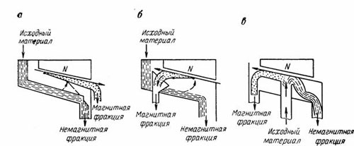 полупротивоточный - исходная руда, направляемая на магнит, разделяется на магнитную и немагнитную фракции, отклоняющиеся под прямыми углами в разные стороны.