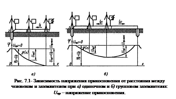 На (рис. 7.2б) показана зависимость напряжения прикосновения от положения человека при групповом заземлителе. В этом случае Uпp имеет наибольшее значение в положении 1 человека, когда он находится между электродами заземлителя, наименьшее значение в положении 2, когда он стоит на заземлителе или его проекции на поверхность земли, в любом промежуточном положении Uпр изменяется от 6 до максимального значения.
