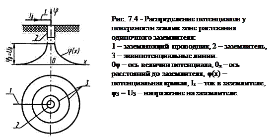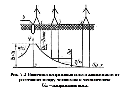 На рис. 7.2 показана зависимость величины напряжения шага от расстояния между человеком и одиночным заземлителем. Напряжение шага наибольшее в положении 1 человека, когда он стоит одной ногой на заземлителе. В положении человека между заземлителем и зоной нулевого потенциала, когда шаг направлен по радиусу к заземлителю, напряжение шага имеет промежуточное значение.
