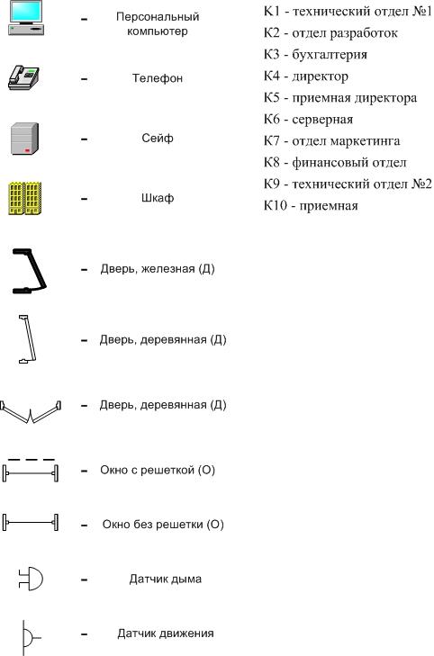 | Шифр помеще-ния | Шифр элемента в помещении | Шифр системы обеспечения безопасности | Режим работы системы обеспечения безопасности |