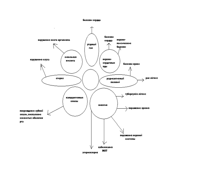 Широкое распространение курения связано со способностью никотина - оказывать на центральную нервную систему человека своеобразное эйфорическое действие, которое сводится к ощущению приятного возбуждения, какого - то душевного подъёма, лёгкости. В первую очередь курение наносит вред сердечно - сосудистой системе и органам дыхания. Под влиянием никотина происходит спазм сосудов и перерождение их внутренней оболочки, к уменьшению просвета сосудов и ухудшению кровотока в различных частях тела. Далее это ведёт к инфаркту- нарушению питания определённого участка сердечной мышцы с её омертвением. Никотин обладает раздражающим действием на надпочечники, которые вырабатывают адреналин. Выделяясь в повышенном количестве во время курения, адреналин приводит к повышению артериального давления. Этот эффект длится примерно 20 минут. В дозах, близких к смертельным, никотин вызывает угнетение дыхательного центра. Смерть при отравлении никотином наступает от паралича дыхания. Наблюдаются при этом и судороги. Среди эффектов никотина следует отметить и вызываемый им спазм привратника желудка: результатом этого является нарушение нормального прохождения пищи, нарушение секреции желудочного сока, приводящие к гастриту и язвенной болезни желудка и двенадцатипёрстной кишки. Эндартериит- это заболевание, проявляющееся в виде так называемой «хромоты». Мышцы ног во время ходьбы страдают от недостатка кислорода и накопления вредных продуктов обмена веществ, и проявляется это в виде онемения и боли. Стопы, начиная с большого пальца, становятся холодными, а потом синюшными. Это заболевание сопровождается сильными болями, похолоданием ног, ломотой, в перспективе - гангрена и ампутация конечностей. Страдают от курения и сосуды, расположенные непосредственно под кожей. Это приводит к нарушению питания, преждевременному старению, потере кожей нормального здорового вида. Одновременно кожа приобретает характерную желтоватую окраску, связанную с отравляющим действием содержащихся в табаке веществ. Неблагоприятное воздействие курения на органы дыхания связано, прежде всего, с прямым раздражением слизистой оболочки табачными смолами. Голосовые связки приходят в состояние хронического воспаления, они утолщаются, становятся более грубыми, что ведёт к изменению тембра голоса. В результате курения развивается воспаление слизистых оболочек органов дыхания, которое вызывает кашель; грубый, хриплый голос - результат воспаления голосовых связок; кроме того, появляется отдышка, а в перспективе возможно развитие туберкулёза и рака лёгких. В лёгких курильщиков происходит ослабление иммунитета: уменьшается количество нейтрализующих микробов, снижается активность поглощающих фагоцитов. В результате у курящих особенно легко развивается воспаление лёгких. У курящих подростков объём грудной клетки отстаёт на 25% от показателей некурящих. Специалисты знают: никотин сужает мельчайшие кровеносные сосуды лица. Из-за ухудшения питания кожи и подкожной клетчатки лицо становится бледно-желтым. Кремы не скроют этот недостаток. Горячий табачный дым воздействует на эмаль зубов. В ней образуются микроскопические трещины, через которые проникают микробы. Без сомнения, курить вредно всем. У женщин так же, как и у мужчин, курение увеличивает риск сердечно 