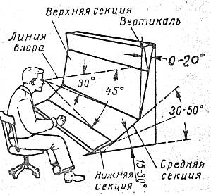 Индикаторы зрительной информации рекомендуется размещать в оптимальных участках поля зрения, которые характеризуются в горизонтальной плоскости углом 30 – 40º и 0-30º вниз от линии взора. Наиболее важные индикаторы располагают на уровне глаз оператора или ниже. Рекомендуемое расположение индикаторных приборов на панелях стендов показано на рис. 2.