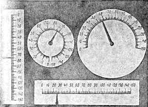 Шкалы бывают двух типов: неподвижная шкала с движущейся стрелкой и подвижная шкала с неподвижным визиром. По своей форме шкалы различаются на круглые, полукруглые, прямоугольные горизонтальные и вертикальные, шкалы типа «открытое окно» (рис. 3).