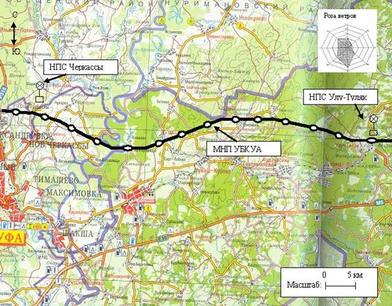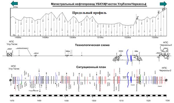Рисунок А1 – Продольный профиль, технологическая схема и ситуационный план МНП УБКУА на участке Улу-Теляк - Черкассы