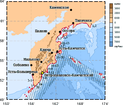 700-километровую зону Дальневосточного побережья. Самые высокие волны при этом отмечены в бухтах Пираткова (10-15 метров) и Ольга (10-13 метров) на Камчатке.