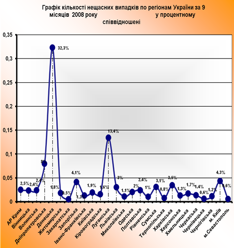 Згідно даних Фонду соціального страхування від нещасних випадків на виробництві та професійних захворювань України за 9 місяців 2008 року порівняно з аналогічним періодом 2007 року кількість випадків травматизму на виробництві зменшилась на 8,8% (або на 1 105 травмованих осіб, з 13 631 до 12 526 [графік 1]), в т.ч. зменшилось на 2,5% кількість випадків із смертельним наслідком (або на 15 травмованих осіб, з 614 до 599). Кількість випадків профзахворювання на виробництві збільшилась на 12,6% (або на 560 осіб, з 4 453 до 5 013), проте зменшилась кількість випадків смерті від профзахворювання на 7,5% (або на 24 особи, з 345 до 321).