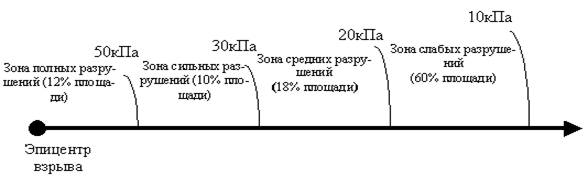 · сильные разрушения при ΔРф ≥ 30-50 кПа (обрушение 50% конструкций зданий. Использование помещений становится невозможным, а ремонт и восстановление - чаще всего нецелесообразным);