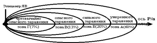 В зависимости от степени радиоактивного заражения и возможных последствий внешнего облучения в районе ядерного взрыва и на следе радиоактивного облака выделяют зоны умеренного, сильного, опасного и чрезвычайно опасного заражения.