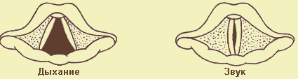 Внутренние мышцы служат для выполнения дыхания и голосообразования. Главными для образования голоса являются истинные голосовые связки - складки, колебания которых и вызывают появление звука. В спокойном состоянии голосовые связки образуют треугольное отверстие - голосовую щель, через которую свободно проходит воздух (см. рис. внизу). Над истинными голосовыми связками располагаются так называемые ложные голосовые связки, а в пространстве между истинными и ложными голосовыми связками имеются углубления, слизистая которых увлажняет голосовые связки.