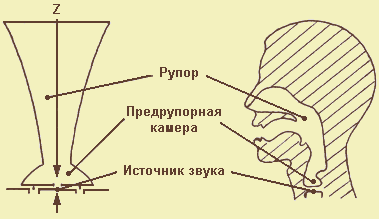 Если мы посмотрим на рисунок, приведённый выше, то обнаружим сходство между рупорным громкоговорителем и голосовым аппаратом певца.