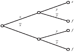 ПРИМЕР. Оператор выполняет два задания - сначала x, а затем y. При этом он может выполнять их как правильно, так и неправильно. Другими словами, неправильно выполняемые задания - единственные ошибки, которые могут появляться в данной ситуации. Требуется построить дерево возможных исходов и найти общую вероятность неправильного выполнения задания. Предполагается, что вероятности статистически независимы. [1]