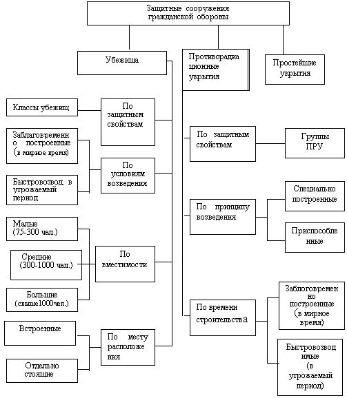 Наиболее эффективным среди указанных мероприятий является укрытие населения в защитных сооружениях гражданской обороны. Защитные сооружения гражданской обороны подразделяются на убежища и противорадиационные укрытия. Кроме того для защиты людей могут применяться и простейшие укрытия (Схема №1).