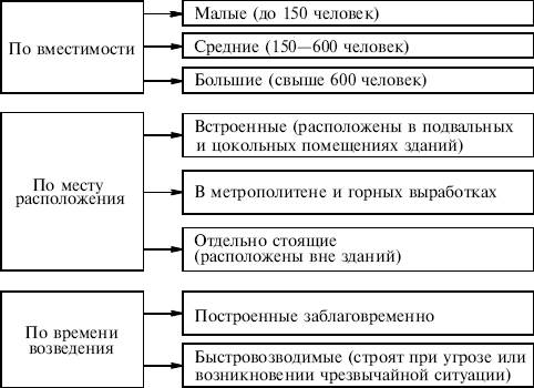 Убежища классифицируют по их защитным свойствам, вместимости, месту расположения, обеспечению фильтровентиляционным оборудованием, времени возведения (Схема №2).