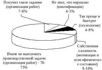 Уровень производственного травматизма формируется под действием совокупности большого количества факторов: технического состояния оборудования; плохая организация работ; низкая квалификация; психофизиологическая несоответствие и недисциплинированность персонала; действие вредных производственных факторов и др.