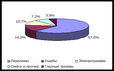 Наиболее частыми повреждениями в результате н/с являются переломы, которые составляют в общей структуре травматизма – 57%, ушибы – 14%; электротравмы – 10,7%; ожоги и прочие – по 7,2% и глазные травмы – 3,9%