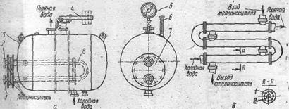 Бойлер (рис. 2, а) представляет собой стальной корпус - цилиндр, внутрь которого через отверстие, герметично закрываемое фланцем, введен змеевик. Теплоноситель поступает в змеевик и отдает тепло холодной воде, поступающей в нижнюю часть цилиндра. Нагретая вода выходит в систему горячего водоснабжения через верхний выходной патрубок.