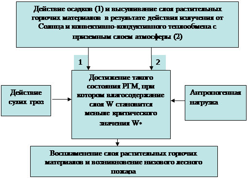 Из схемы Рис.1. видно, что под действием осадков и при высушивании слоя растительных горючих материалов, достигается такое состояние РГМ, при котором влагосодержание слоя становится меньше критического значения. Именно в этом случае под воздействием сухих гроз, а также под воздействием антропогенной нагрузки происходит воспламенение растительных горючих материалов и возникает низовой лесной пожар.