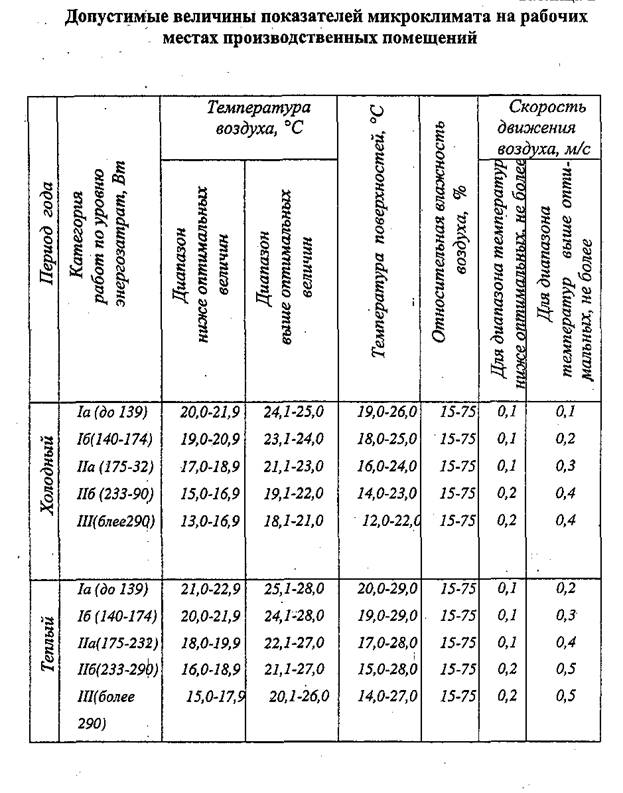 Для допустимых условий труда значения параметров должны соответствовать данным таблицы. При этом допускаются перепады температур по высоте не более 3 °С, по горизонтали для работ 1а, 6-4 °С, Па, б - 5 °С, III - 6 °С.
