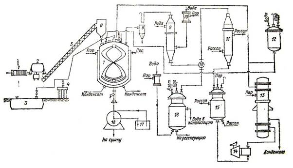 Щелочную целлюлозу загружают через загрузочный люк, люк закрывают и в аппарат подают хлористый метил. Нагрев массы до 65 ± 10 оС осуществляется в течении около 1ч. Затем включают систему циркуляции. Повышающееся при подъеме температуры давление регулируют при помощи специального клапана на циркуляционной линии. В этом процессе избыточное давление поддерживается в пределах 4 – 5 кгс/см 2. Циркулирующий хлористый метил уносит с собой образующийся метиловый спирт, который конденсируется в холодильнике 9 при 30 – 40 оС. Поскольку метиловый спирт уходит из сферы реакции, диметиловый эфир почти не образуется. После отделения побочных продуктов неконденсированный газ поступает в компрессор и через подогреватель 13 вновь попадает в реактор. Горячий циркулирующий газ уносит воду из реактора, осушая при этом щелочную целлюлозу. С одной стороны, это приводит к уменьшению расхода хлористого метила на побочные реакции, с другой, ухудшает растворимость метилцеллюлозы, так как затрудняется доступ реагента к ОН-группам в сухой щелочной целлюлозе, что приводит к неоднородности конечного продукта. Для устранения этого явления циркулирующий хлористый метил увлажняют до 12 – 21 %. Продолжительность процесса составляет 5 – 6ч. По окончании процесса метилирования метилцеллюлозу подвергают дальнейшей обработке.