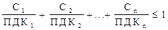 При одновременном содержании в воздухе рабочей зоны нескольких вредных веществ однонаправленного действия сумма отношений фактических концентраций каждого из них (С1, С2,..., Сп) в воздухе помещений к их ПДК (ПДК1, ПДК2, ПДКn) не должна превышать