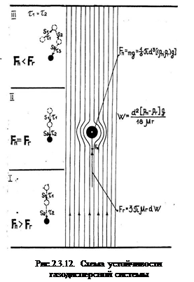 Время, в течение которого пылинка может находиться в воздухе во взвешенном состоянии, определяется, прежде всего, её размерами и плотностью. Витание или осаждение пыли зависит от соотношения силы тяжести, действующей на частицу (Fn ), и силы сопротивления газовой среды (Fr ) . Если размеры пыли и плотность больше, то пылинка, падает с возрастающей скоростью, так как сопротивление газовой среды ничтожно мало (рис.2.3.12, положение I) . Если размеры пыли (шарообразной формы) малы, а сопротивление газовой среды велико, и наступает такой момент, когда Fn = Fr (положение II, рис.2.3.12), то пылинка находится в состоянии витания в восходящем потоке воздуха или падает с постоянной скоростью (w) в спокойном воздухе, подчиняясь закону Стокса. Обычно определяют эту скорость, приравнивая силу тяжести к силе сопротивления газовой среды.