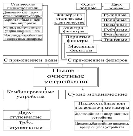 Средства защиты от пыли разделяются на общие, с помощью средств обеспечивается улучшение условий труда в производственном помещении в целом или на рабочих местах вблизи источников пылеобразования, и индивидуальные, применение которых защищает органы дыхания, лицо и глаза рабочих. К общим средствам защиты относятся системы естественной и искусственной вентиляции, применение различных пылеулавливающих аппаратов для удаления пыли из помещений и рабочих зон непосредственно от мест её образования и ряд организационных мер, направленных на снижение запыленности и уборку пыли на промышленных и рабочих местах. Очистка воздуха от пыли рабочих помещений осуществляется путем улавливания и осаждения ее специальными устройствами. Пылеулавливающие аппараты основаны на различных принципах и имеют разнообразные конструктивные решения. В связи с этим предложены различные классификации пылеулавливающих устройств. Все пылеулавливающие устройства можно разделить на четыре большие группы (рис.2.3.13.): а) сухие, механические аппараты; б) аппараты с применением воды; в) аппараты с применением фильтров; г) комбинированные устройства.