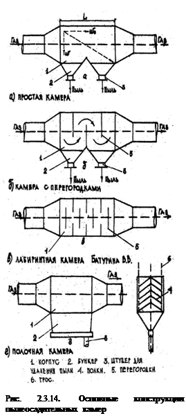 Таким образом, основными параметрами, определяющими эффективность аппаратов по степени очистки в зависимости от диаметра и плотности вещества частиц (2.3.26), являются высота и длина пылеотстойных камер (2.3.29). Как показывает формула (2.3.25), резкое уменьшение скорости движения воздуха увеличивает эффективность улавливания пыли. При скоростях движения воздуха 0,3 - 0,4 м/с улавливаются частицы пыли диаметром 15-25 мкм. Для уменьшения скорости воздуха до 0,02-0,01 м/с приходится строить камеры большого сечения. Вторым направлением по повышению эффективности улавливания пыли в камерах (рис.2.3.14) является устройство перегородок, лабиринтов, полок и других устройств и приспособлений, устанавливаемых на пути движения запыленного воздуха. Это направление дает возможность более эффективно использовать скорость осаждения W1 за счёт силы тяжести (2.3.26) и использовать эффект оседания и прилипания к поверхности частиц пыли.