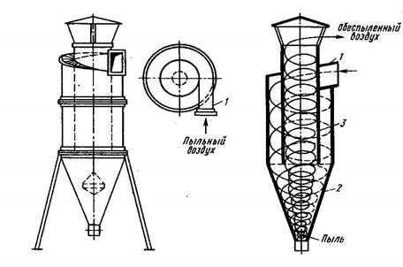 Cтруя запыленного воздуха поступает из трубопровода в циклон по касательной к его круглому сечению и движется вниз по спирали между наружным кожухом и внутренней выходной трубой. При таком движении на пылинки действуют центробежные силы, отбрасывающие пылинки к стенке, где они укрупняются в агрегаты. С поступательным движением воздуха эти пылинки опускаются в нижний кожух циклона и в приемный бункер. Циклоны эффективны при очистке воздуха от пыли с размером частиц 10 мкм и более. При размере пылинок 5 мкм эффективность работы не превышает уже 50 %, поэтому внутренние стенки циклона увлажняют. Применяют в сочетании с другими способами улавливания пыли. Скорость движения воздуха для эффективной очистки воздуха должна быть не менее 15-18 м/с.