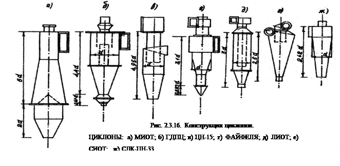 Центробежные пылеотделители (циклоны) более эффективны, чем пылестойкие камеры, так как циклон с объемом 0,15 м3 имеет производительность 1000 м3 /ч. Циклоны различных конструкций (рис.2.3.19) можно ставить на нагнетающий и всасывающий трубопровод.