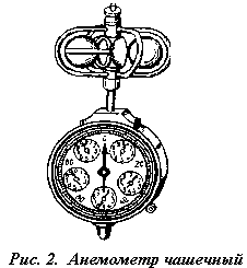 Анемометры используются крыльчатые (для замеров скоростей от 1 до 10 м/с), чашечные (для замеров скоростей от 1 до 30 м/с) и электроанемометры (для замера скоростей воздуха от 0 до 5 м/с) (рис. 2). Анемометр состоит из вращающегося под действием воздушного потока воспринимающего механизма (крыльчатки и чашечки) и счетчика, снабженного тремя стрелками, указывающими на соответствующих шкалах величину пути, пройденного воздушным потоком.