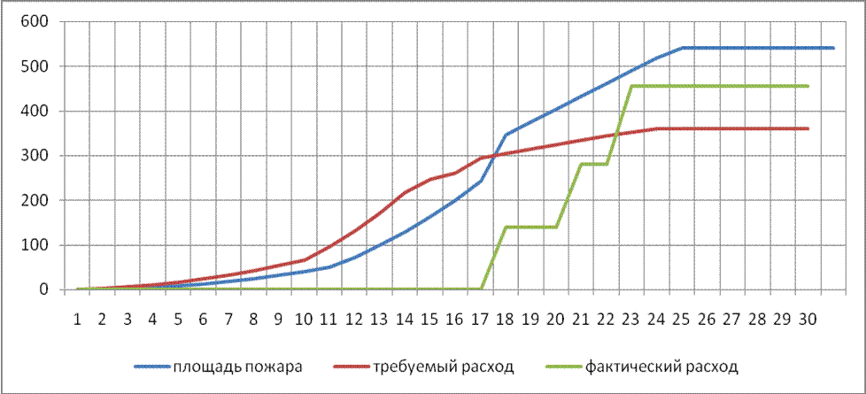 SП (τ) – изменение площади тушения и требуемого расхода воды.