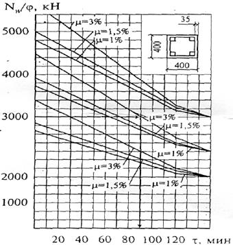 Для определения предела огнестойкости следует на графике (см. рис. 1) из точки соответствующей отношению N/j провести горизонталь до пересечения с кривой соответствующей В-25 и μ.
