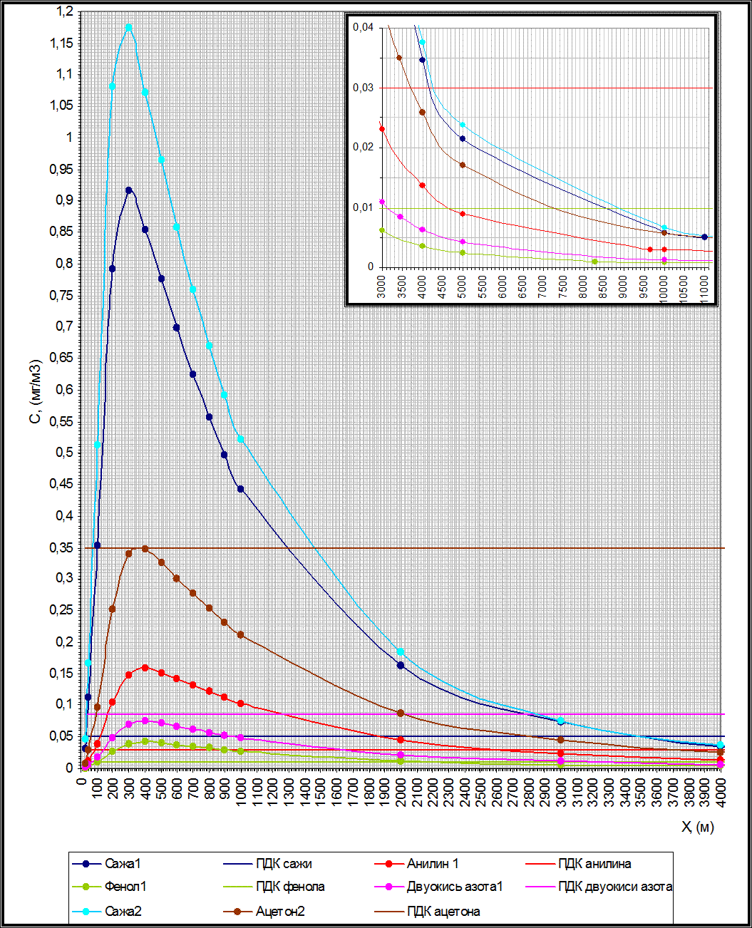 4. По графикам сделать вывод о влиянии предприятия на окружающую среду, т.е. сравнить полученные значения концентраций веществ с величинами их ПДК.