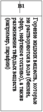 | В (взрыво-пожароопасная) | Легковоспламеняющиеся, горючие и трудногорючие жидкости, твёрдые горючие и трудногорючие вещества и материалы, которые способны при взаимодействии с водой, кислородом воздуха или друг с другом только гореть, при условии, что помещение, где они присутствуют или используются, не относятся к категории А или Б |