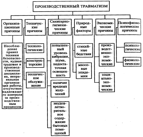 Одним из важнейших условий борьбы с производственным травматизмом является систематический анализ причин его возникновения, которые делятся на технические и организационные. Первый вид причин производственного травматизма проявляется в большинстве случаев как результат конструктивных недостатков оборудования, недостаточности освещения, неисправности защитных средств, оградительных устройств. Ко второму виду причин относят несоблюдение правил техники безопасности из-за неподготовленности самих работников, низкая трудовая и производственная дисциплина, неправильная организация работы, отсутствие на предприятии надлежащего контроля за производственным процессом.