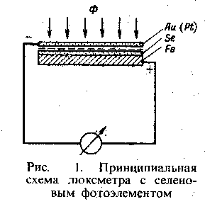В инженерной практике оценка световых величин в основном сводится к измерению освещенности. Чаще всего это измерение производят с помощью приборов, называемых люксметрами. Основные части люксметра — фотоэлемент и миллиамперметр, градуированный в единицах освещенности — люксах. Наиболее широко применяют люксметры Ю-15, Ю-16 или Ю-17 с селеновым фотоэлементом. Принципиальная схема объективного люксметра показана на рис.1. Светочувствительный слой селена фотоэлемента наносят на стальную пластину. На поверхность селена напыляют тончайший (5 нм) полупрозрачный слой золота или платины. Между этими двумя слоями образуется так называемый «запирающий слой» с односторонней проводимостью. Стальная пластина и полупрозрачный слой являются двумя электродами.