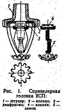 Спринклеры изготавливают на различные температуры срабатывания: 72, 93, 141 и 182°С. Наибольшее распространение получили сринклерные головки типа 2СП (рис. 1)