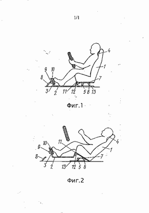 И так, при создавшейся экстремальной дорожной ситуации и предвидя столкновение автомобиля с препятствием, водитель интуитивно, резко и с усилием нажимает на педаль тормоза 9. (В такой ситуации усилие нажатия на педаль может достигать 70-100 кг, тогда как, при обычной или спортивной манере езды, оно не превышает 30-40 кг). Именно при таком аварийном торможении, сигнал с педали тормоза передаётся на фиксаторы передних опор 5 кресла 1, удерживающих его в транспортном положении. Фиксаторы размыкаются и кресло при помощи, например, рессоры, наклоняется назад, увлекая за собой поддон 2, и фиксируется в этом положении. При этом, по мере наклона кресла, оно за счёт шарнира 7, на задних опорах 6, и передвигаясь на салазках 13, сдвигается в заднее положение, тем самым, ещё более отдаляя водителя от травмирующих элементов салона (педалей, рулевой колонки, панели управления и рулевого колеса). Поддон 2, удаляясь от пола кузова, и благодаря разъёмным штокам 8 педалей 9, увлекает за собой их подушки 10. Храповик на шарнирном соединении 11 поддона 2 и ограничитель 12 стабилизируют поддон в определённом положении, исключая его колебания.