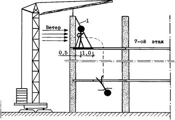 Рис. В-7. Схема обстоятельств несчастного случая (пунктиром показана траектория падения в проем лифтовой шахты): 1 – струбцина временного крепления стеновой панели.