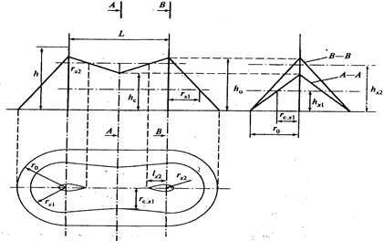 Конфигурация вертикальных и горизонтальных сечений стандартных зон защиты двойного стержневого молниеотвода (высотой h и расстоянием L между молниеотводами) представлена на рис. 3.2. Построение внешних областей зон двойного молниеотвода (полуконусов с габаритами h0 , r0 ) производится по формулам для одиночных стержневых молниеотводов, Размеры внутренних областей определяются параметрами h0 и hc , первый из которых задает максимальную высоту зоны непосредственно у молниеотводов, а второй – минимальную высоту зоны по середине между молниеотводами. При расстоянии между молниеотводами L Ј Lc граница зоны не имеет провеса (hc = h0 ). Для расстояний Lc Ј L і Lmax высота hc определяется по выражению