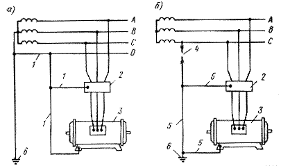 Защитным заземлением называется преднамеренное металлическое соединение с землей в сетях переменного тока с изолированной нейтралью или в сетях постоянного тока с изолированной средней точкой частей электроустановок, нормально не находящихся под напряжением, но которые могут случайно оказаться под напряжением по тем или иным причинам. Соединение это выполняют проводником, который называют заземляющим. Заземляющий проводник присоединяют к заземлителю, имеющему непосредственное соединение с землей. При замыкании фазы на корпус электрооборудования большая часть тока замыкания пройдет через заземляющий проводник, а меньшая через тело человека, прикоснувшегося к электрооборудованию, так как сопротивление металлического проводника во много раз меньше, чем сопротивление тела человека. Схема присоединения электрооборудования к защитному заземлению показана на рис. XV.1, б.