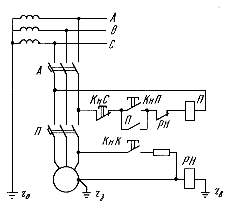 Схема защитного отключения с быстродействующим реле показана на рис. XV.2. Между корпусом электрооборудования и вспомогательным заземлителем rв включено защитное реле напряжения РН, реагирующее на величину напряжения по отношению к земле. Электрооборудование может быть заземлено через заземлитель rз или занулено через заземлитель r0 . При замыкании фазы на корпус электрооборудования на нем появляется напряжение. Если это напряжение превысит заданную величину, реле РН срабатывает, его контакт в цепи обмотки пускателя П размыкается и магнитный пускатель отключает электродвигатель от сети. Кнопка КнК служит для проверки действия защиты; КнП и КнС — кнопки пуска и остановки электродвигателя.