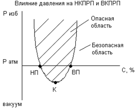 С повышением давления область опасных концентраций расширяется. С понижением – суживается и сходится в критической точке К.